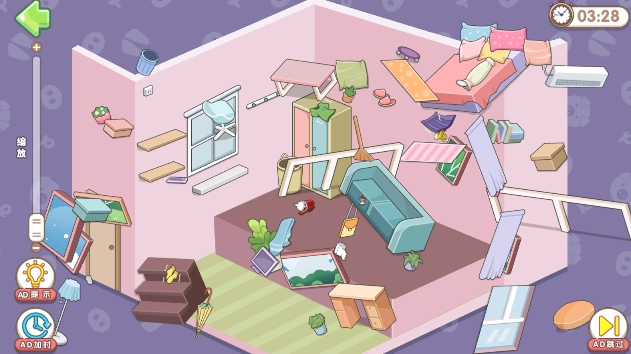 选择温馨小屋关卡来整理你的房间,把所有物品都放到正确的位置进行收纳