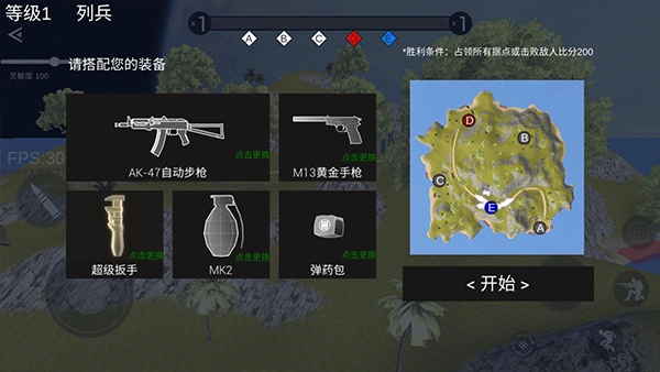 进入游戏前,先依据个人喜好搭配好合适的装备,接着点击“开始”按钮进入战场。