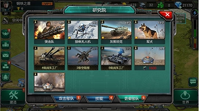 研究院下设三个核心板块:攻击部队、防御部队和技能研究。其研究范畴覆盖这三大领域的属性提升工作。技能的解锁需同时满足研究院等级、空指挥等级、战车工厂等级以及武装指挥部等级的要求,部分研究项目还可借助图纸开展进阶深化研究。研究过程主要消耗的资源是石油,若想加快研究进度,也可以使用钻石进行加速。