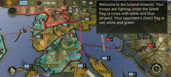 游戏刚开始时,你的军队会在希腊国旗(那面蓝白相间的十字旗)下战斗,对手则是打着意大利旗帜(红白绿三色旗)的一方。