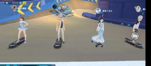 我开始了一场新推出的滑板模式,赛季更新之后,玩家可以通各种高超技术的操作,在新的赛道上驰骋。车手都穿的非常好看,狐仙大人更是仙气十足。飘逸的古风长袍,不知道多少少女拜倒在袍下。旁边身着金色西装礼服的小哥也不赖,而我穿着淡蓝色的礼服小短裙,及肩褐色的头发也是很美的。一场比赛就大饱我的眼福。