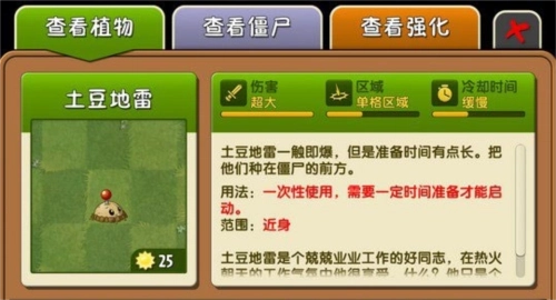 这两种植物的爆发效果都挺鸡肋的。土豆雷能瞬间破土这点还不错,既能应急用,也能用来对付雪人——等雪人走到第一格时立刻种下,然后马上喂能量豆就行。不过它们的分裂能力实在太坑了,挺考验运气的。