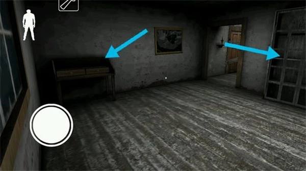 下楼梯后,左边地板上有一根黑线,从上面经过时铃铛会发出声响,需要留意。楼梯旁边的柜子可以用来躲藏,柜子对面有一扇门,里面或许会刷新物品。柜子旁边还有一扇通往地下室的门(因为画面比较昏暗)。