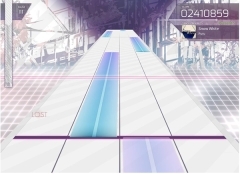 6、在此处点击“开始游戏”,这里设有新手教程。在游戏过程中,当出现接触判定线的地面音符时,要记得在四条轨道里点击正确的那一条。