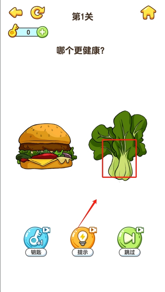 1. 在第一关的界面当中,点击右侧的绿色蔬菜图标,然后选择健康食物的选项。