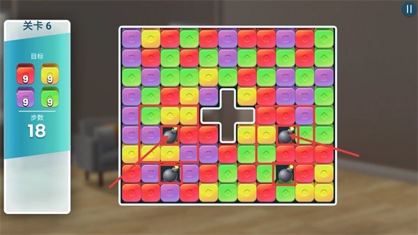 3、当剩余步数为【18】时,使用炸弹道具来加快消除进度,达成四种颜色每种收集【9】个的目标。