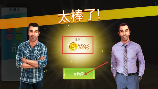4、完成当前关卡后可获得【收入-728】金币,点击【继续】按钮,即可开启下一关的消除挑战,从而积累更多金币。