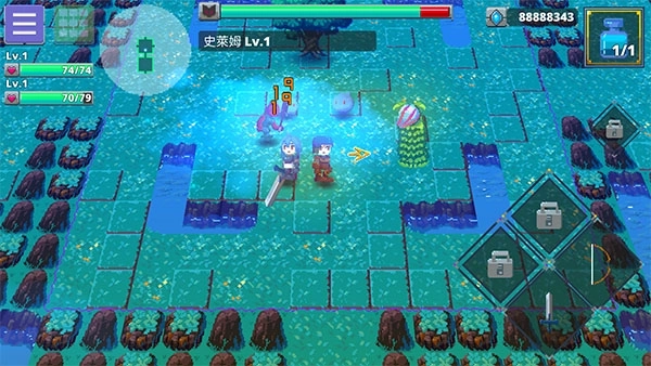 7、召唤伙伴后进入探索区域,遭遇怪物时可使用右下角的剑或弓发起攻击。