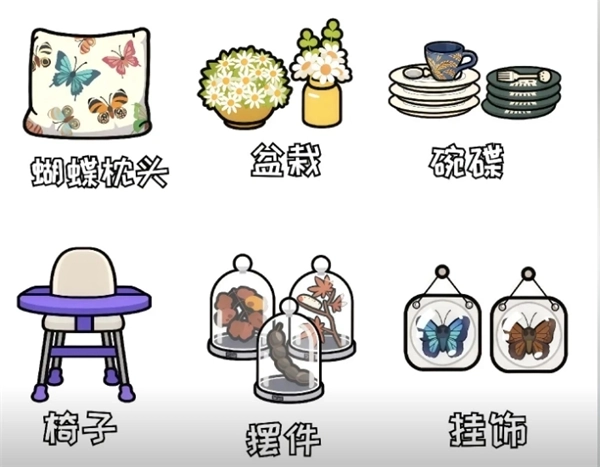 蝴蝶枕头、盆裁、碗碟、椅子、摆件、挂饰