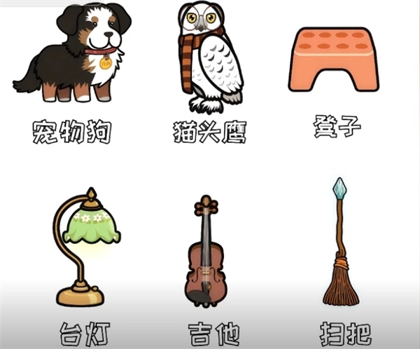 宠物狗、猫头鹰、凳子、台灯、吉他、扫把