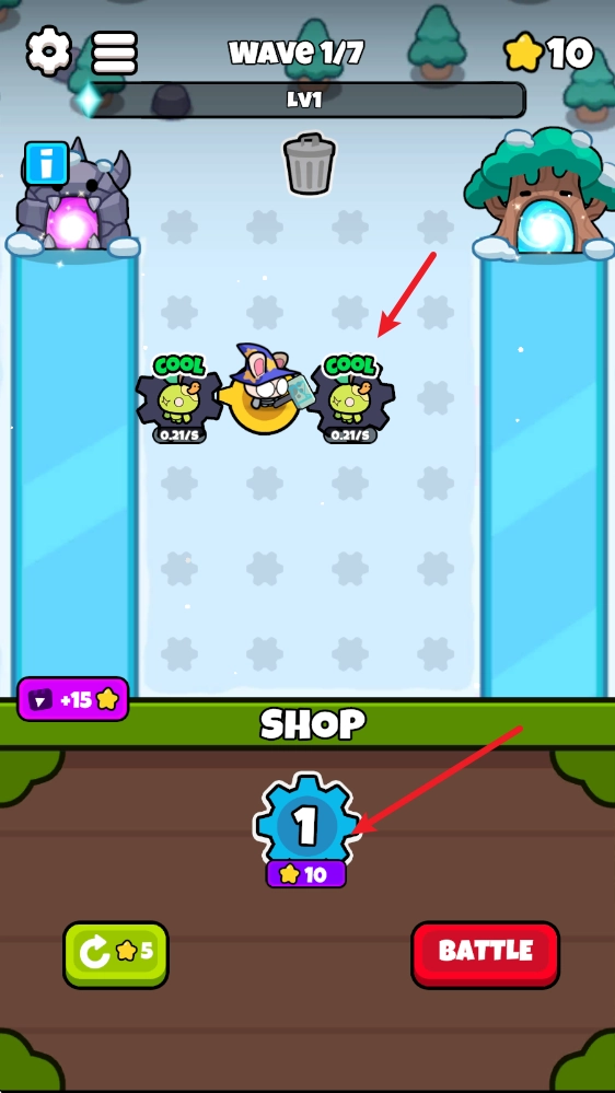 每打完一轮战斗,我们就能休整一下,把相同的齿轮拖到一起重叠就能完成合成。