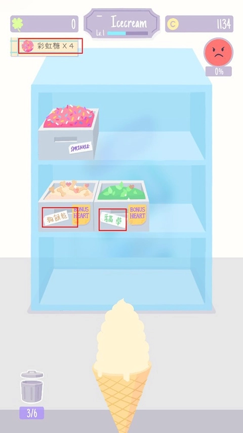 4、接着添加口味适宜的冰淇淋,把甜筒放进冰淇淋机,长按屏幕,等蓝线出现就能停止操作了,要是没做到这一点,制作就会失败,得把失败的成品丢到左下角的垃圾桶里重新制作。