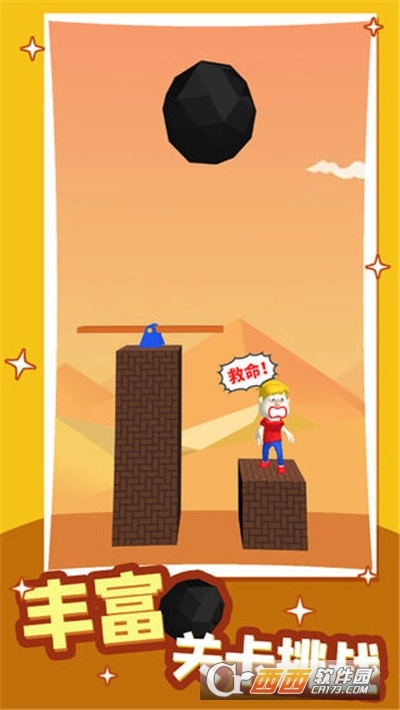 2、关卡挑战十分的丰富,每一个关卡小哥哥都被绑在绳子上,有不同的情境,玩家需要根据不同的任务来剪断绳子,别以为很简单哦。