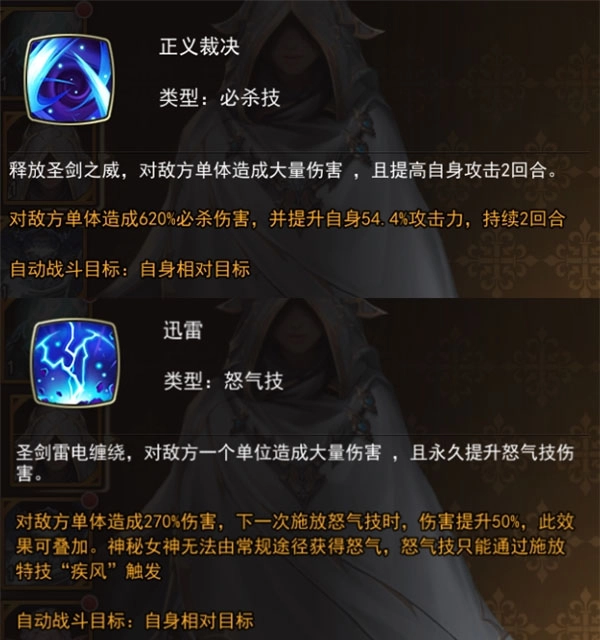 必杀技·正义裁决:对敌方单个目标造成600%的必杀伤害,同时使自身攻击力提高46.7%,效果持续两个回合。