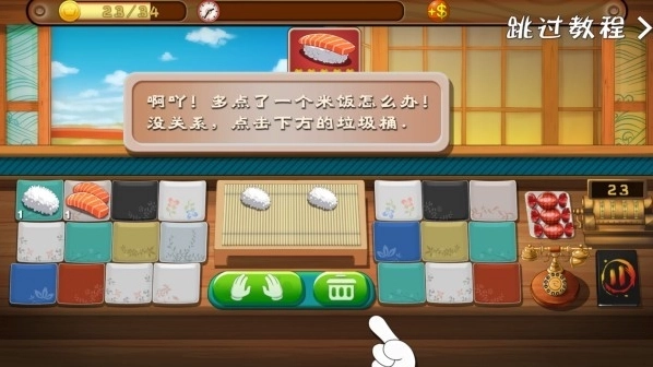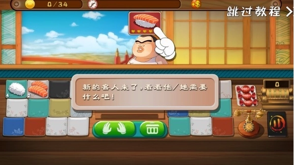 2、第一次玩,我们可以跟着教程学习如何玩这款游戏,我们经营这家寿司店,最重要的就是顾客,看他需要哪种食物,及时做出来给他。