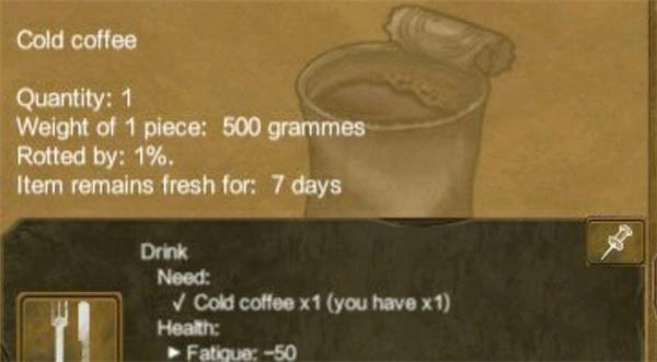 不要食用腐烂的蔬菜,以防中毒,这也会影响你提升烹饪技能;另外咖啡分冷热两种,热咖啡能减少50点疲劳值、30点口渴度和5点饥饿度。