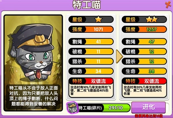 日本田园猫的技能对绳子有百分比伤害加成,还能造成三段打击,威力相当强劲。和特工喵不同,它释放技能无需瞄准,而且技能自带穿透效果,操作起来也特别便捷。