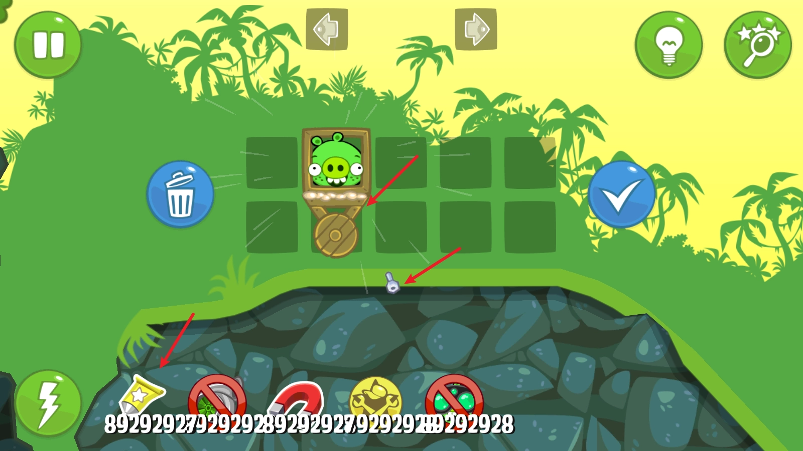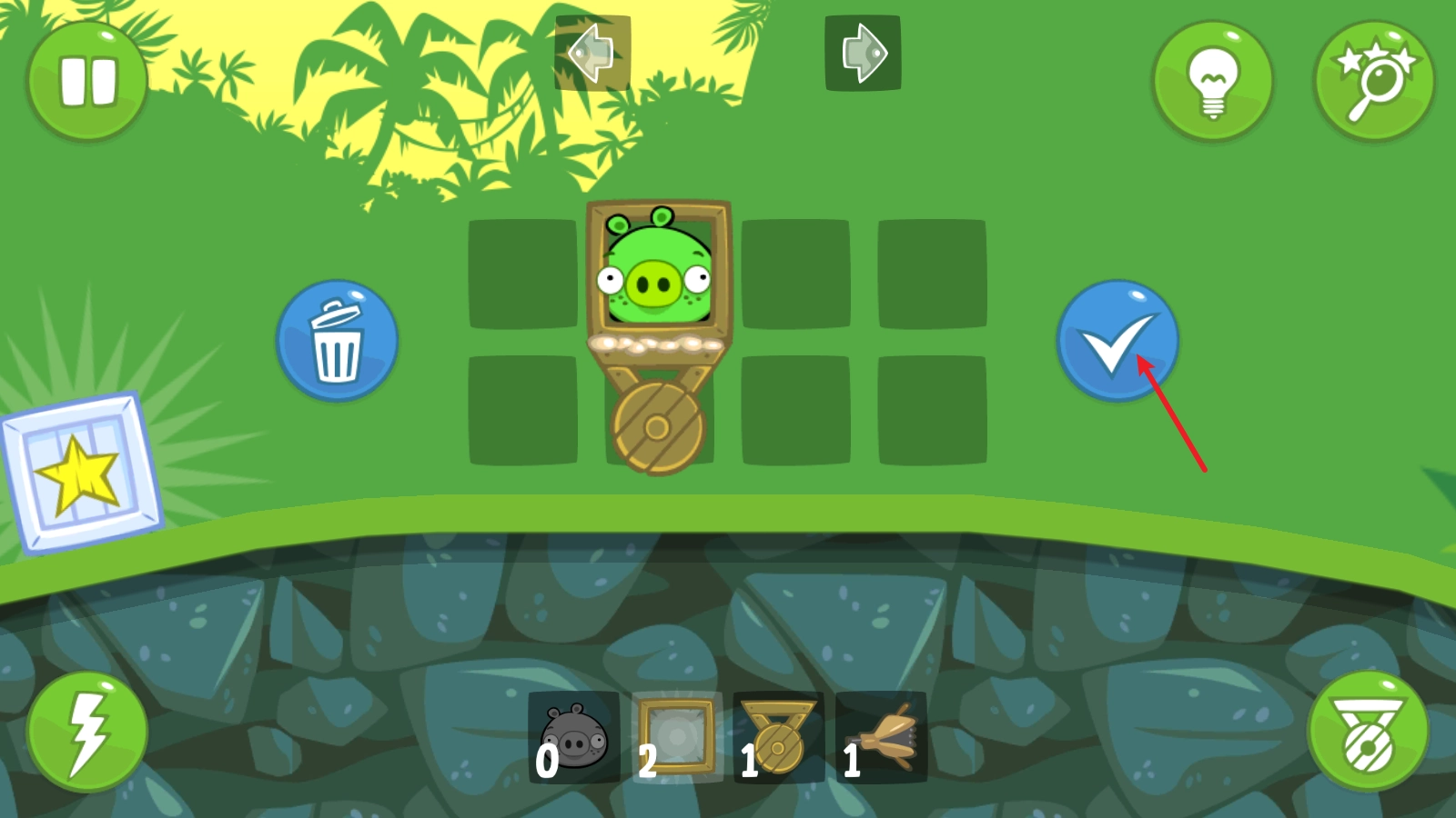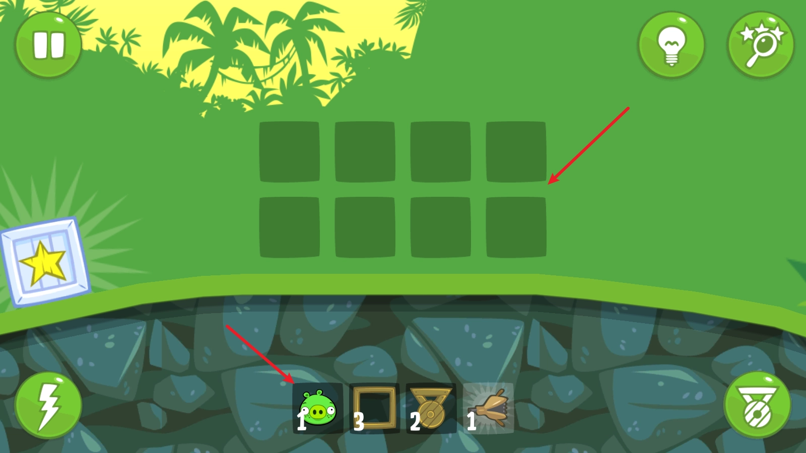进入关卡后,屏幕中间会出现若干空白格子,你需要通过组装各类道具来运送捣蛋猪。