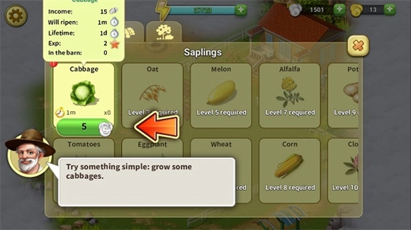 使用金币能够解锁农作物,对应的农作物成长周期与经验值,点击后可查看详细数据。