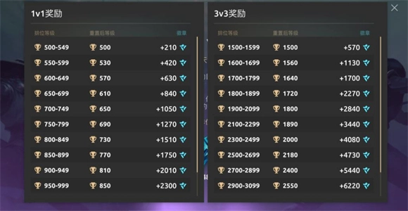 排位模式为真人在线对战,包含1v1与3v3两种模式。参与排位赛获胜可获得排位积分,失败则扣除积分;非排位赛无论胜负均无积分增减。徽章奖励依据1v1和3v3的排位积分发放,其中1v1模式从500积分起开始奖励,3v3模式则从1500积分起开始奖励。当积分达到对应标准时,即可获得徽章奖励,徽章积分每月会进行重置,具体规则可参考图示。徽章可用于在商店兑换专属皮肤、2个皮肤箱子以及2个碎片箱子。