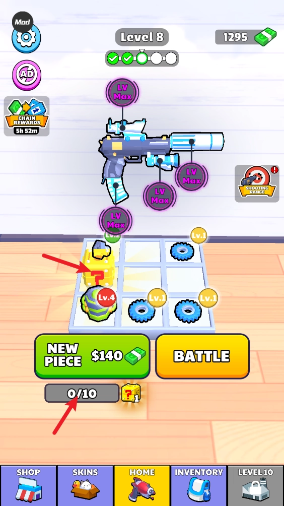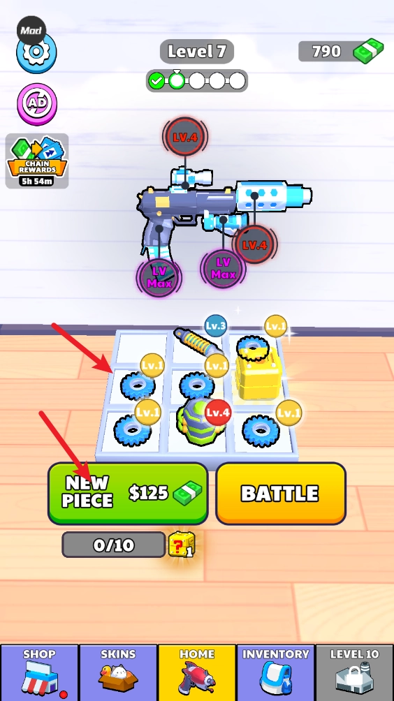 回到主界面后,我们能够用货币购买各类零件,相同的零件还可以通过合成来升级。