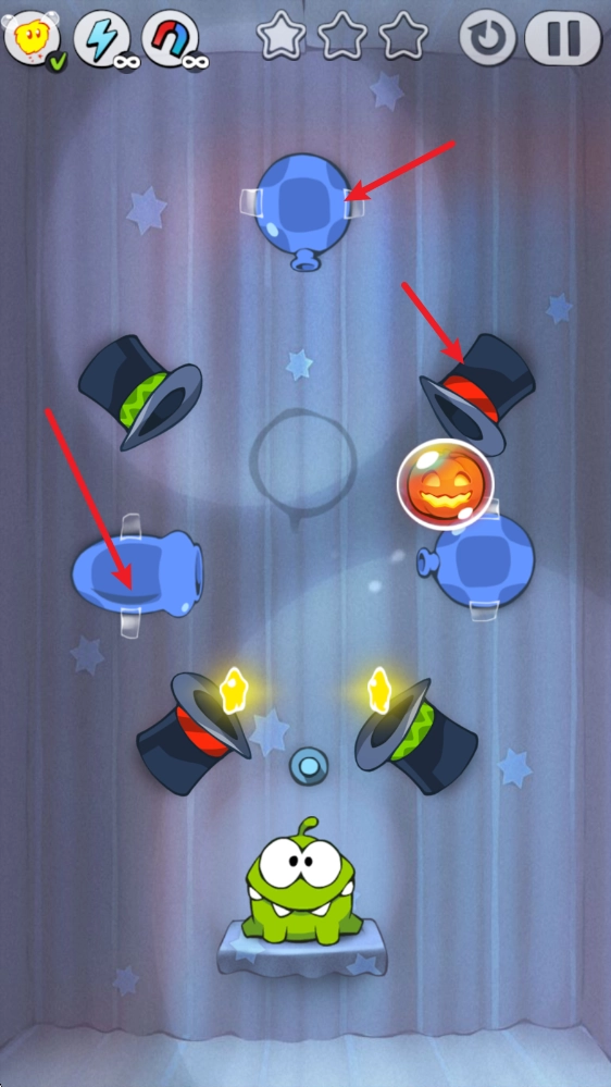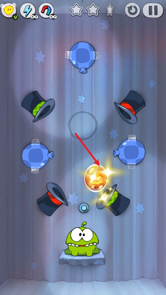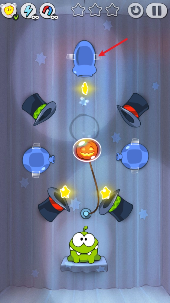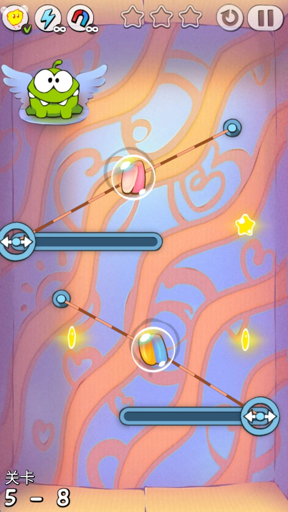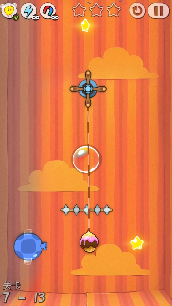 接下来看看这一关如何完美通关,首先我们切断绳子,让糖果跟着泡泡一起移动,这样就能获取最上方的星星。