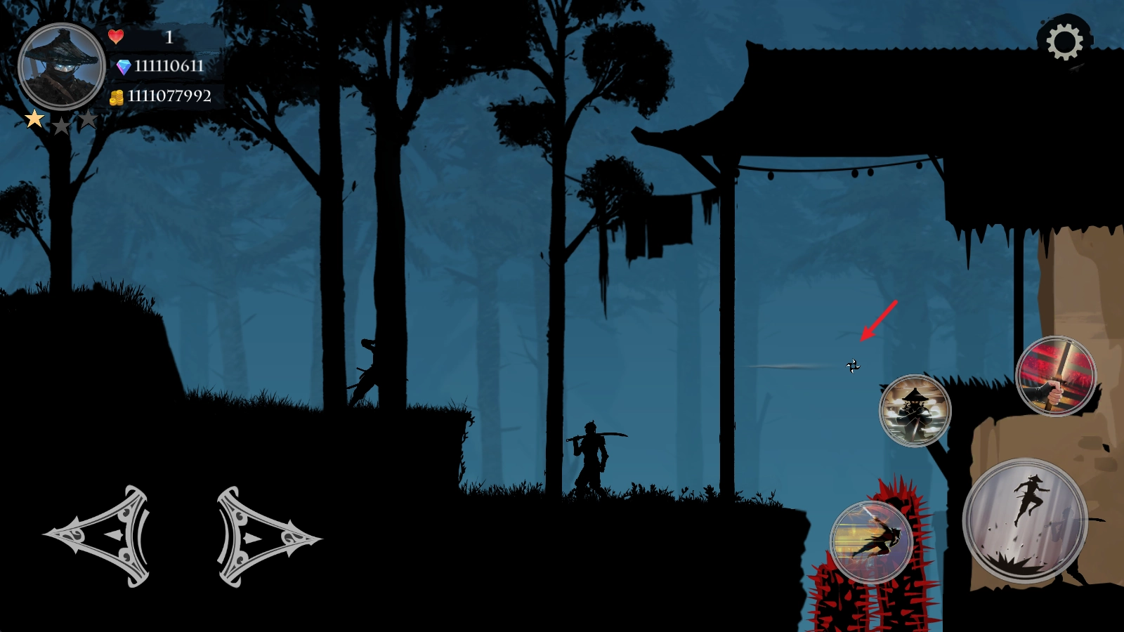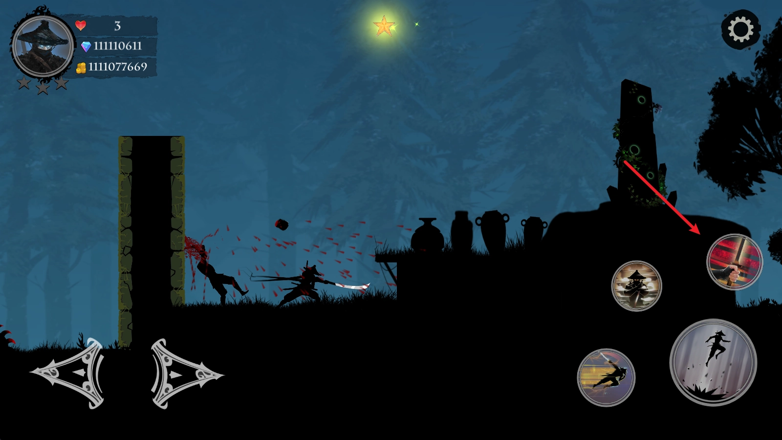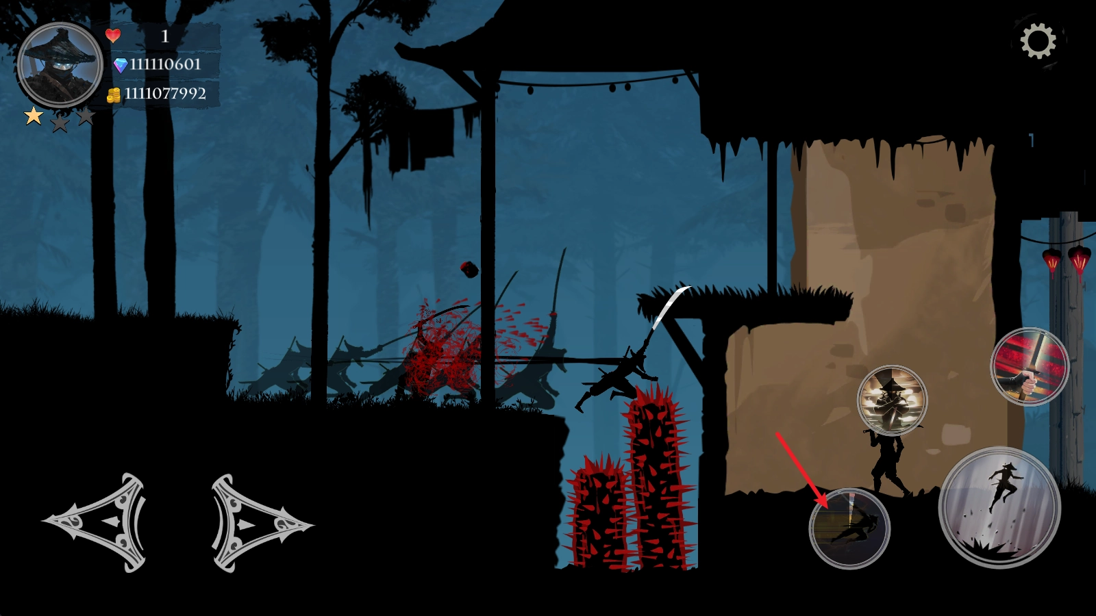 当我们靠近敌人后,点击右侧的攻击键,就能用武士刀发起攻击。