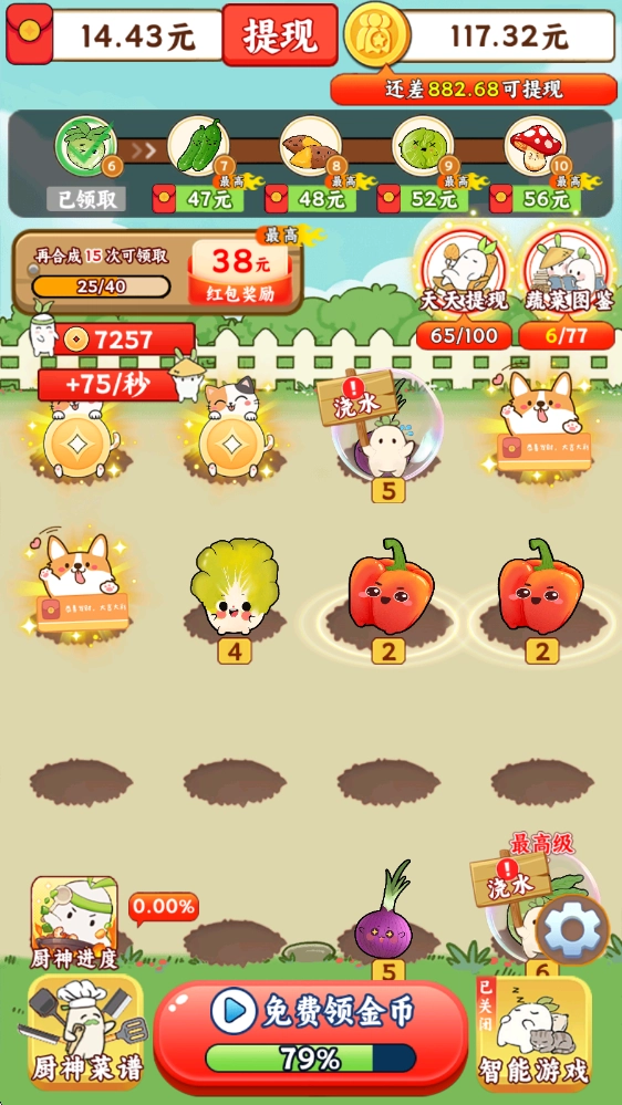每次进行合成操作都能得到相应奖励,而且首次解锁新蔬菜时还会有额外福利可领,蔬菜的等级越高,所获得的奖励就越丰厚。