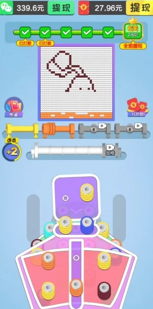 在每一个关卡里,我们都会看到色彩缤纷的毛线团,点击毛线团就能把它放到相应颜色的柱子上。
