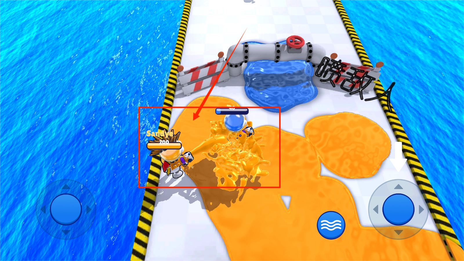 基础操作借助虚拟摇杆操控移动,按住射击键可调节喷射角度,不同染料枪在射程和扩散范围上存在差异。