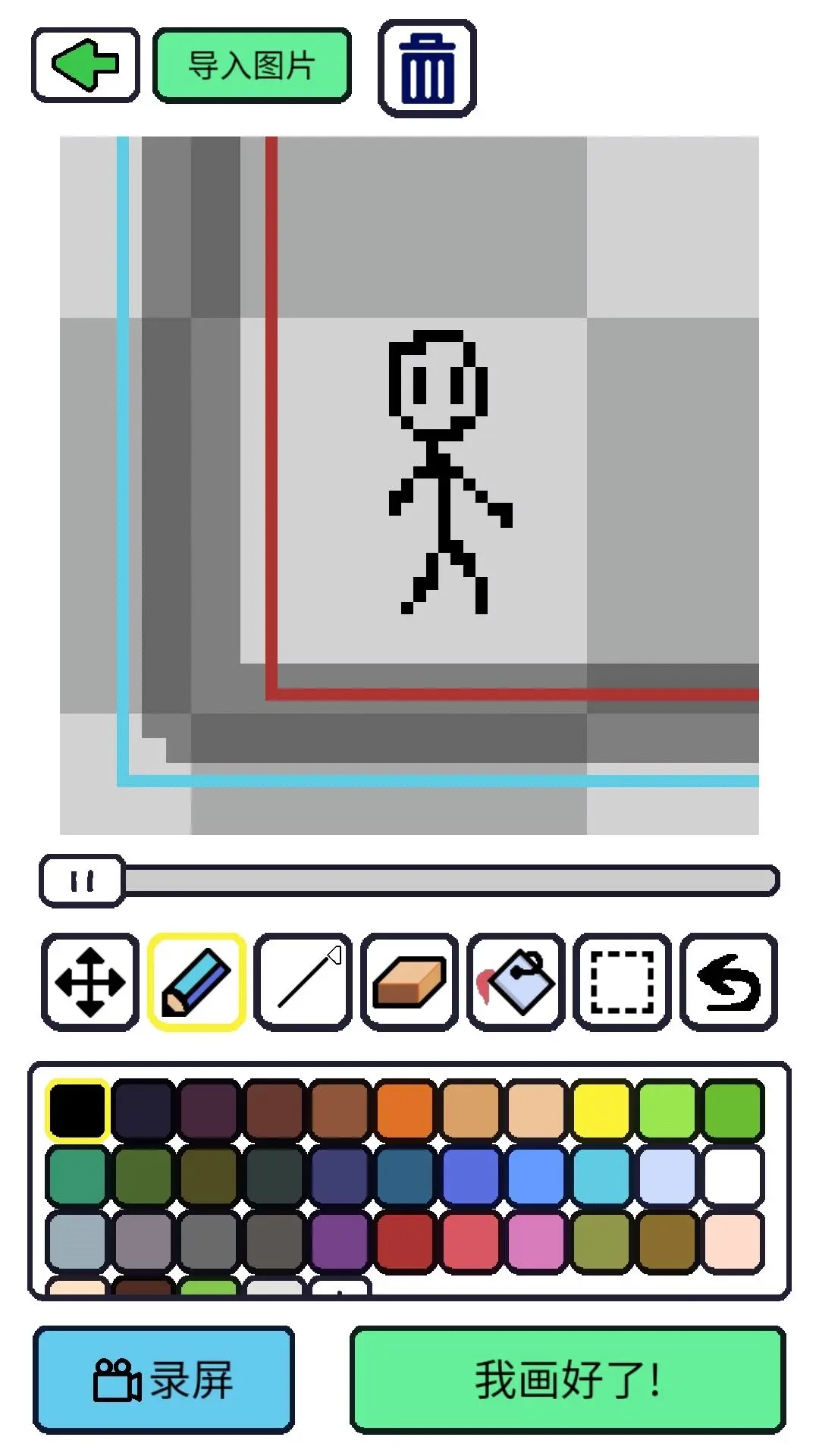 接着用第一个移动工具把某个区域放大到一个背景格的尺寸(画像素画时要把笔刷大小设为最小,因为最小的画笔宽度刚好是一像素)