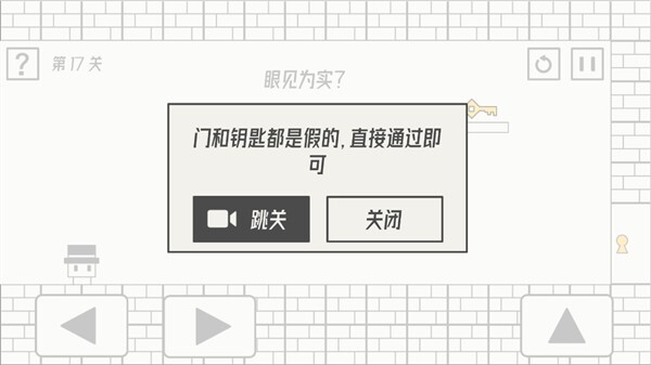 第17关通关方法:此关卡中的门与钥匙并非真实可用,玩家径直前行通过该关卡就行。