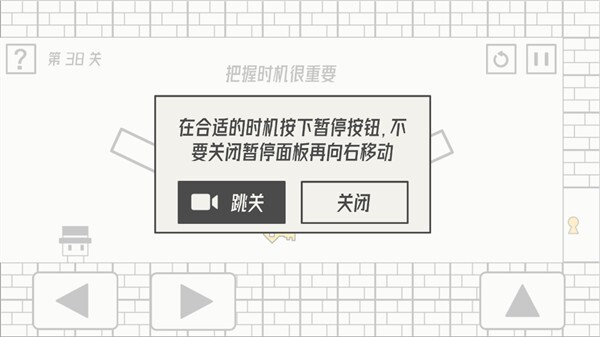 第38关攻略:在恰当的时机点击暂停按钮,不要关闭暂停面板,接着向右移动。