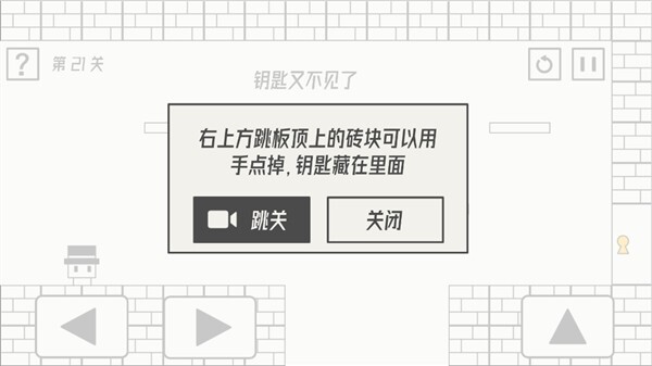 第21关玩法:右上方跳板顶部的砖块,用手点击就能去掉,钥匙就藏在那儿。