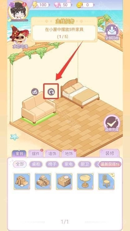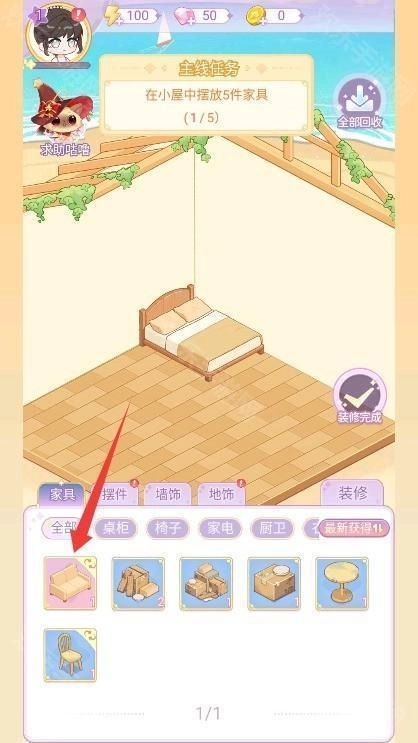 1、启动进入游戏后查看主线任务指引,点击装修按钮进入房间设计操作界面。