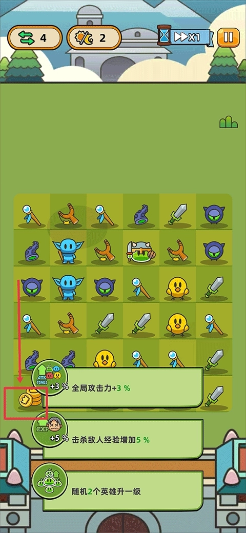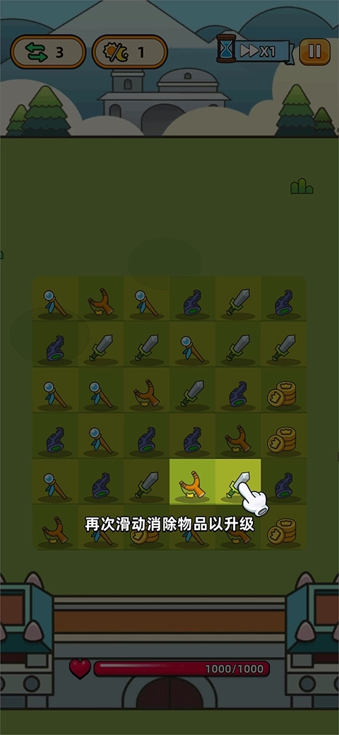 1、双击打开勇闯要塞,你可以通过滑动来移动物品位置,当3个或3个以上物品在同一行或一列时可合成不同属性的英雄;
