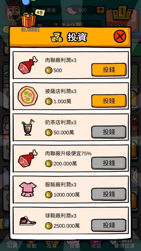 3、各种有趣的投资项目尽情投资,体验有趣的经营;