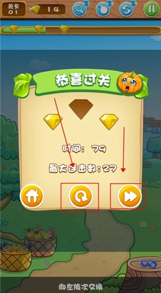 5、只要消除掉所有的蔬菜水果就能赢得本关卡的胜利,之后可以选择重新挑战当前关卡,也可以直接进入下一关继续游戏。