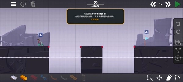3、新手教程结束后,玩家就能正式进入游戏环节,此时需要借助左下方的材料来搭建桥梁;