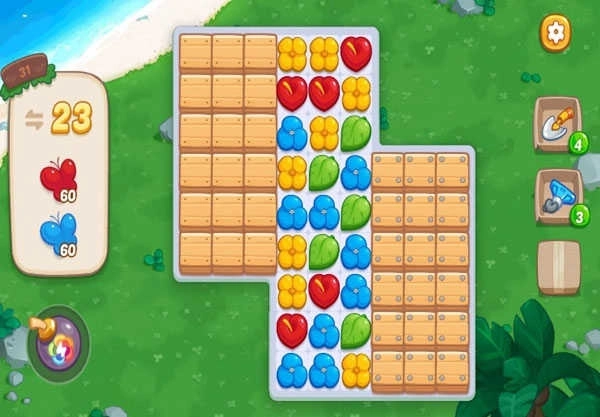 第31关目标为各收集60只红蓝蝴蝶,共23步。前期聚焦击碎生成蝴蝶的容器,促使花朵下坠激活机关;注意掉落花色仅限三种,攒够9朵同色即可合成钻石,再配合其他道具形成范围清除,为新一轮下落腾出空间。