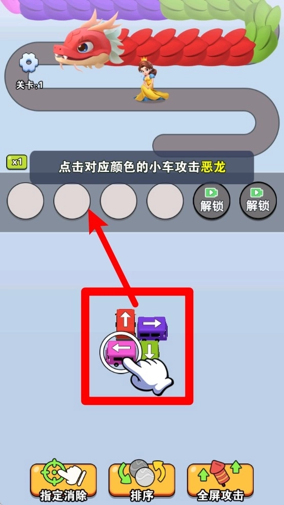 1.点击颜色相同的小车发起攻击,通过精准的操作助力公主击退前方恶龙的威胁,清除通路障碍以实现快速推进。