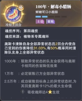 当遭遇破甲、重伤、中毒或灼烧这类负面状态时,部分魂师能借此打出爆发性伤害(像剑尘心就依赖破甲效果),一旦被这类伤害命中,阵容容易出现缺口,核心魂师的陨落更可能直接导致战局失利。应对这类负面状态,可借助奥斯卡的第四魂技——解毒小腊肠来化解。