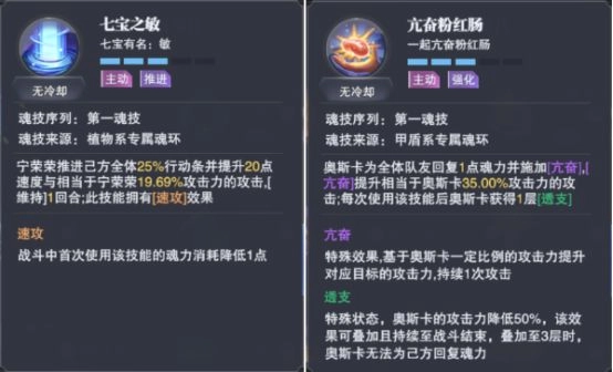 游戏里还存在一些能够提升伤害的增益效果,像宁荣荣的第一魂技“七宝之敏”,在为队友提升行动速度的同时,也能增强他们的输出能力;而奥斯卡的第一魂技“亢奋粉红肠”,则是在为队友补充魂力的同时,附带了增加伤害的效果。