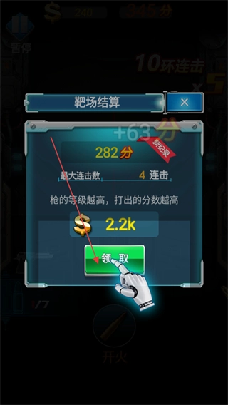 4、射击完毕后,查看靶场结算的分数,点击领取按钮来获取游戏奖励。