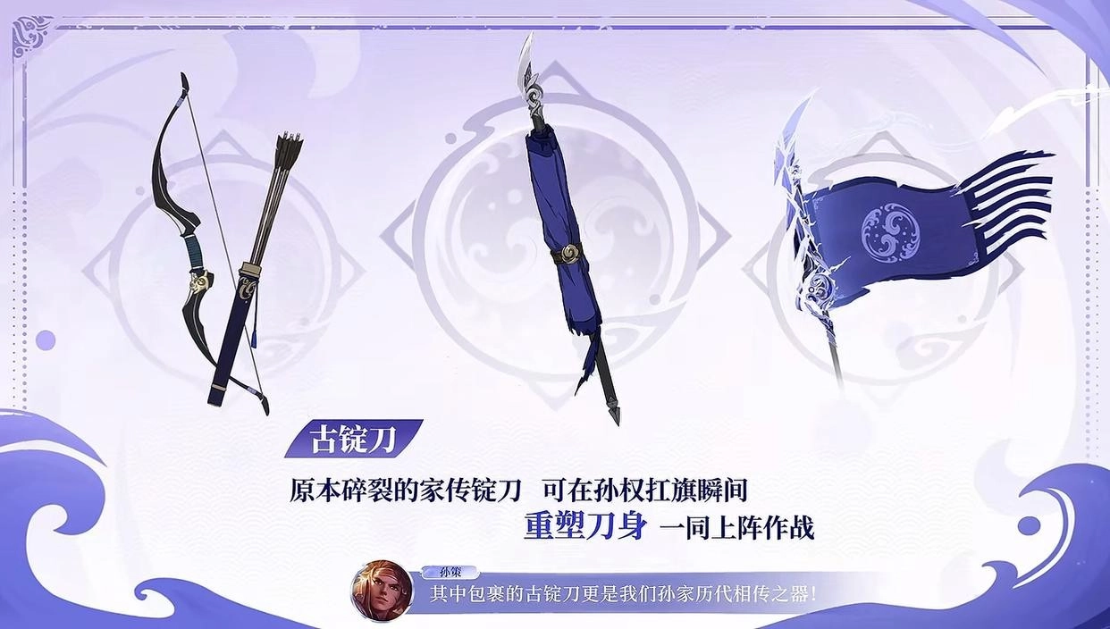 局内孙权使用的武器为弓箭和绑着古锭刀的军旗。