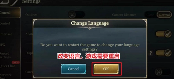 在选择简体中文后,游戏会弹出需要重启的提示,此时点击ok按钮即可重启游戏。