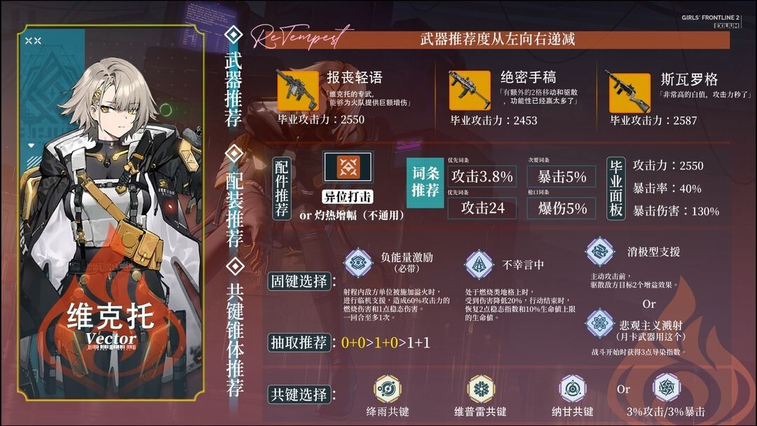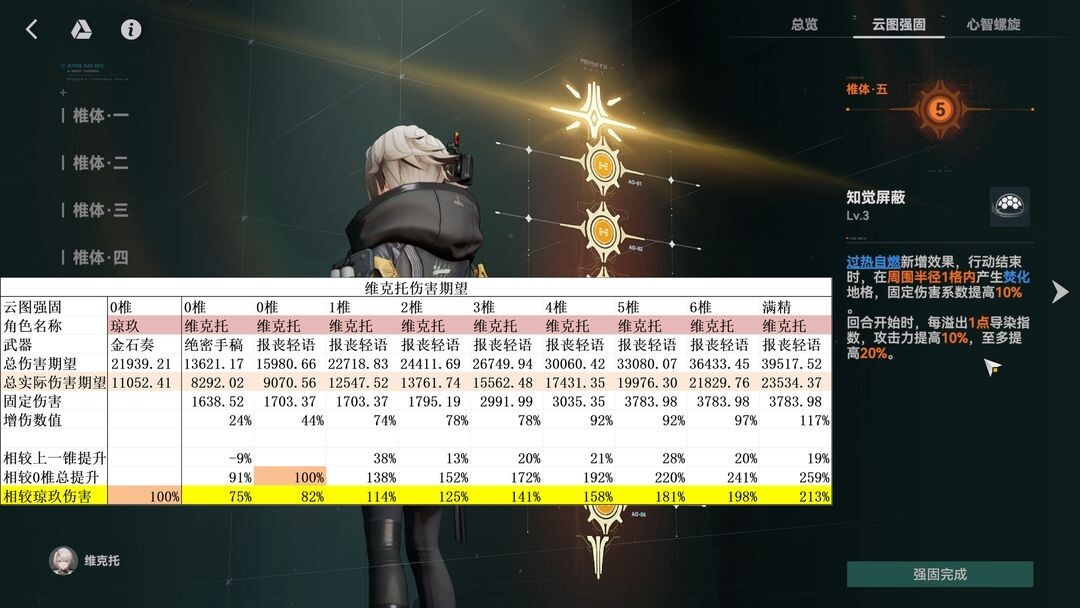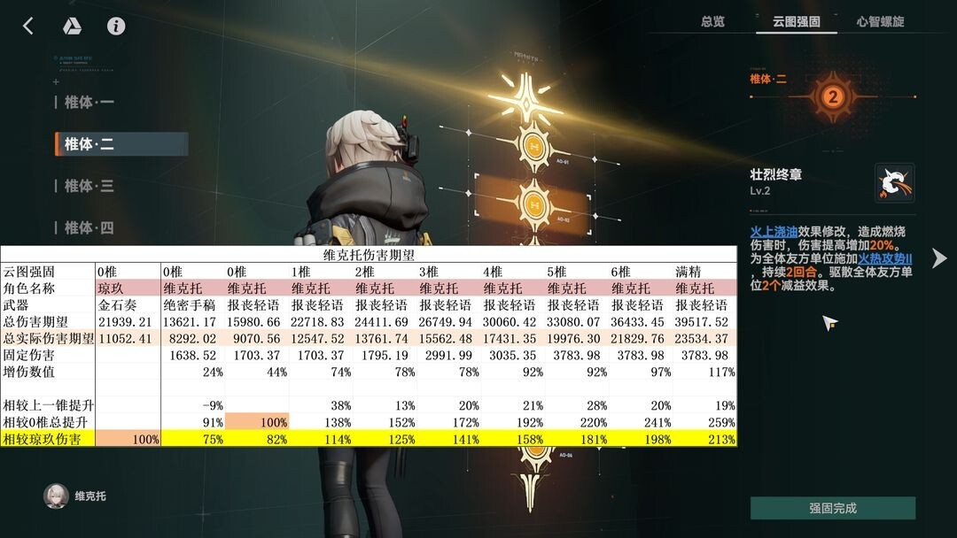 维克托1椎的优先级远高于专武,1+1的配置下几乎能解锁全部辅助能力。2椎存在两个问题:一是覆盖率仅为五分之二,但因行动结束的角色不会消耗本回合buff,对琼玖这类回合外出伤的角色而言,覆盖率可提升至五分之三;二是若队伍携带科谢尼娅这类能赋予【火热攻势】的奶妈,2椎的收益几乎为零。桑朵莱希自身无法主动施加Buff,且其Buff仅持续一回合,因此琼玖无法享受到桑朵莱希的增伤效果。