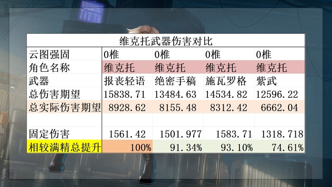 在装备大月卡武器时,维克托的输出大约能达到0.75玖。要知道此前所有辅助角色的伤害都没突破0.4玖,就连旧版本的强力主C托洛洛,伤害期望也才0.6玖。这样一对比,维克托的输出能力有多夸张就很清楚了——哪怕是刚入坑的萌新,也完全可以把vv(维克托)当成输出角色来培养。