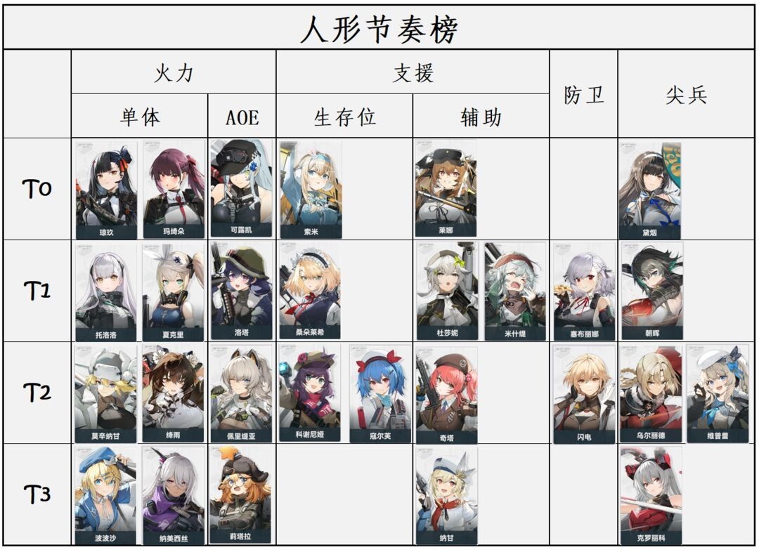 e、每个人形都有其独特之处和适用场景,这份节奏榜仅对萌新组建自己的首支散搭队伍有参考价值。随着游戏进程的推进和对玩法的深入研究,大家会形成更深刻的理解,到那时强度榜就只剩下“节奏”层面的意义了。