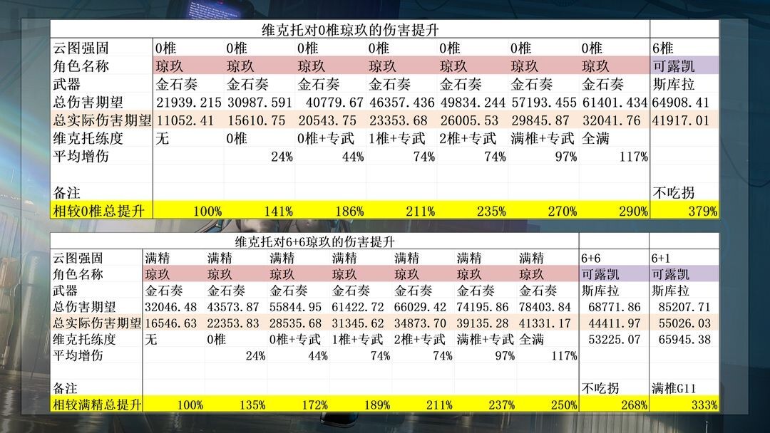 接下来要讲的是维克托的增伤效果,这里针对0+1琼玖和6+6琼玖这两种情况,分别统计了两组数据来分析提升幅度。需要说明的是,我计算的是整体的提升数值,并非完全以0椎琼玖作为唯一参照标准。0椎的维克托能够为整个队伍带来平均25%的燃烧属性伤害加成,不过更关键的提升点在于增加了一次支援机会,而且这个效果对维克托自身同样适用。单是0椎维克托,就能让琼玖的总伤害提升大约35%,但它更大的作用体现在属性克制方面的破稳能力强化上。